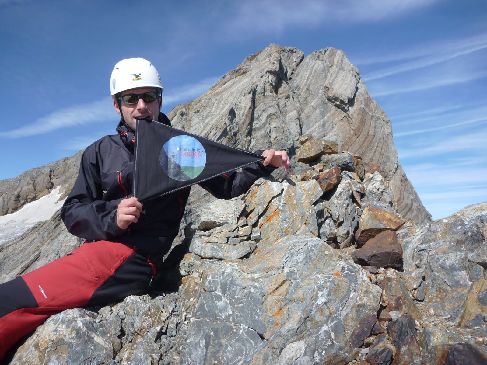 Tardamos unos 10 minutos en alcanzar el hito que marca la cima (sujetando la bandera porque el fuerte viento no la dejaba quieta) Al fondo el Pique Longue o Comachibosa (en aragones)
